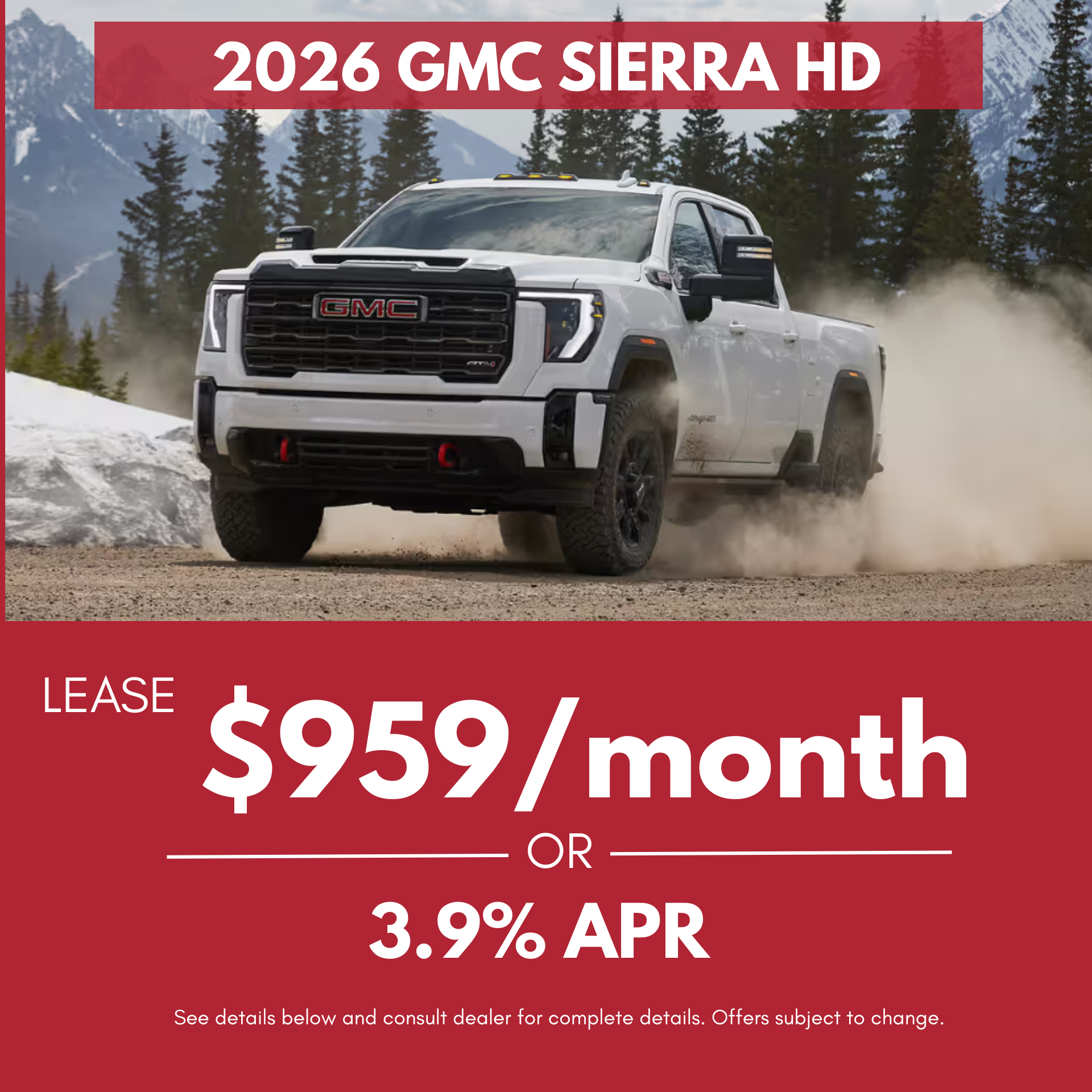 $959 Per Month for 36 months. 10k Miles, $3999 down plus tax, fees and up fronts. Stock #260208. While supplies last. 3.9% for 36 months to approved credit.