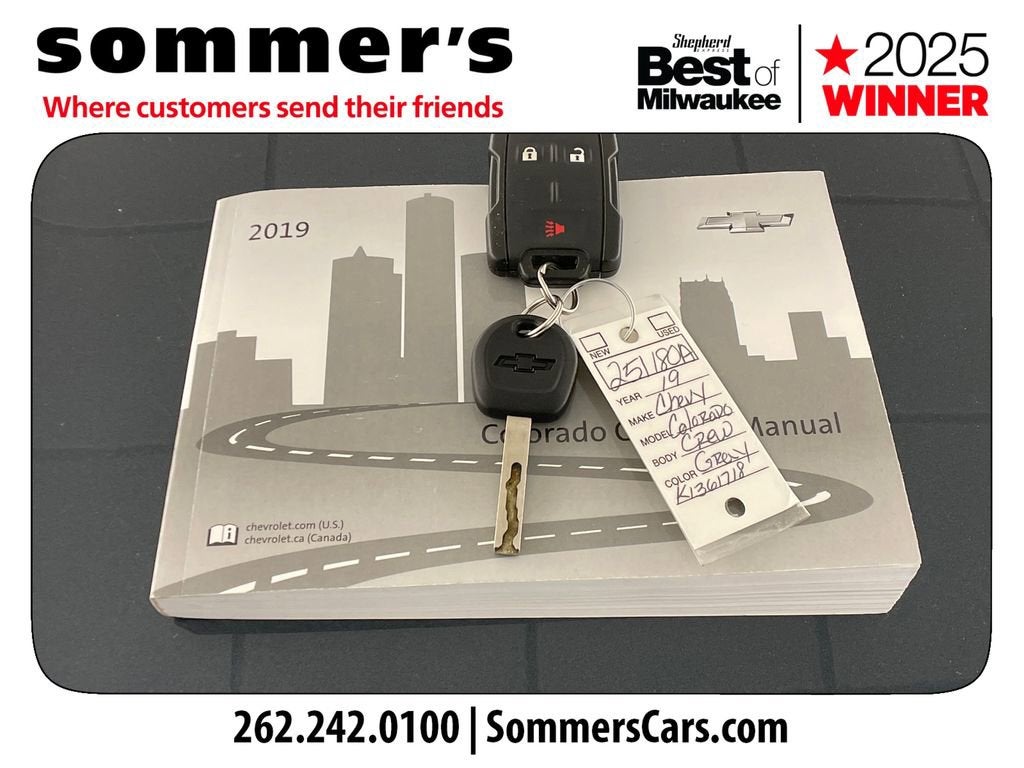 Find this 2019 Chevrolet Colorado WT Crew Cab at Sommer's Automotive in Mequon, just north of Milwaukee serving Wisconsin drivers from Cedarburg, Grafton, Port Washington, Shorewood, Whitefish Bay, Fox Point, Bayside, Glendale, Wauwatosa, Brookfield, West Bend, Menomonee Falls, Germantown, Sussex, Hartford, Oconomowoc, Pewaukee, New Berlin, Franklin, Oak Creek, Racine, Kenosha, Muskego, Mukwonago, Hales Corners, Cudahy, South Milwaukee, and many more communities throughout the greater Milwaukee, Ozaukee County, Washington County, Waukesha County, and southeastern Wisconsin area.