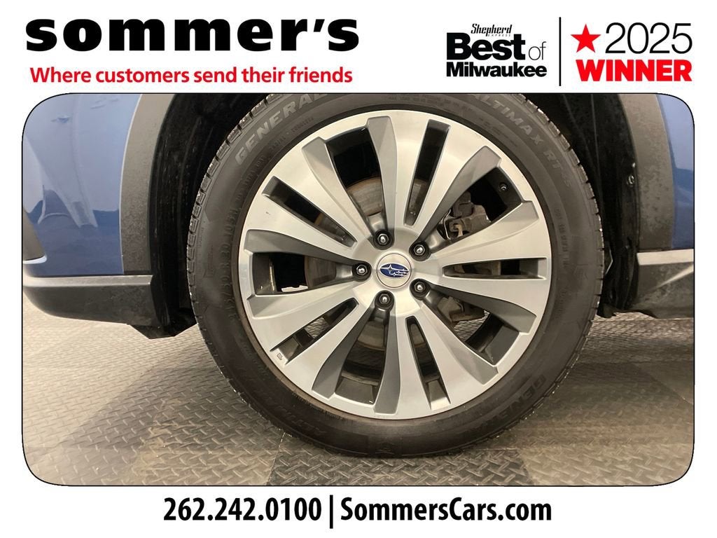 AWD | 2.4L turbo H-4 | Lineartronic CVT | 21/27 MPG | 7-passenger seating | Panoramic roof | Navigation w/Apple CarPlay & Android Auto | Bluetooth®, HD & satellite radio | Back-up camera | Power liftgate | Heated front seats | Power driver seat | Tri-zone climate w/rear A/C | Keyless entry | Blind spot monitor & rear cross-traffic alert | Adaptive cruise, lane keep assist, pre-collision braking, knee airbag | LED headlights/DRL & LED brakelights | Fog lamps | Heated mirrors w/turn signals | Aluminum wheels | Abyss Blue Pearl | Slate Black interior
