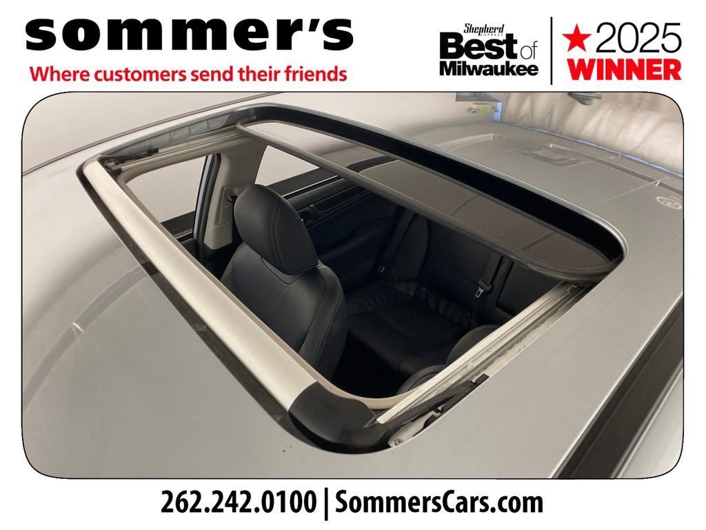 Ice Silver Metallic paint is complemented by aluminum wheels, LED headlights, fog lamps, and a power moonroof. The Slate Black leather interior features woodgrain trim and a refined, spacious cabin.
