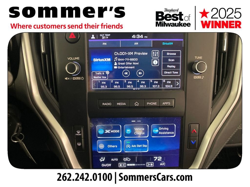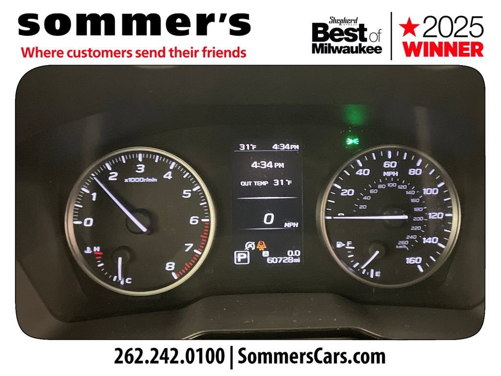 AWD | 2.5L H-4 | CVT | 26/33 MPG | EyeSight pre-collision braking, adaptive cruise & lane keep | Apple CarPlay/Android Auto | Backup camera | LED headlights w/auto high beam | DRL | Rear spoiler | Luggage rack/roof rails | Aluminum wheels | Keyless entry | Power windows/locks | Trip computer | Smart device integration | Magnetite Gray Metallic | Slate Black interior