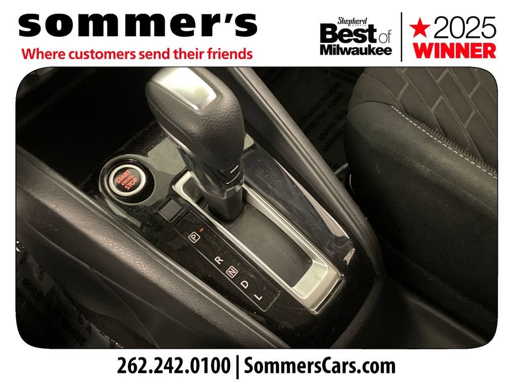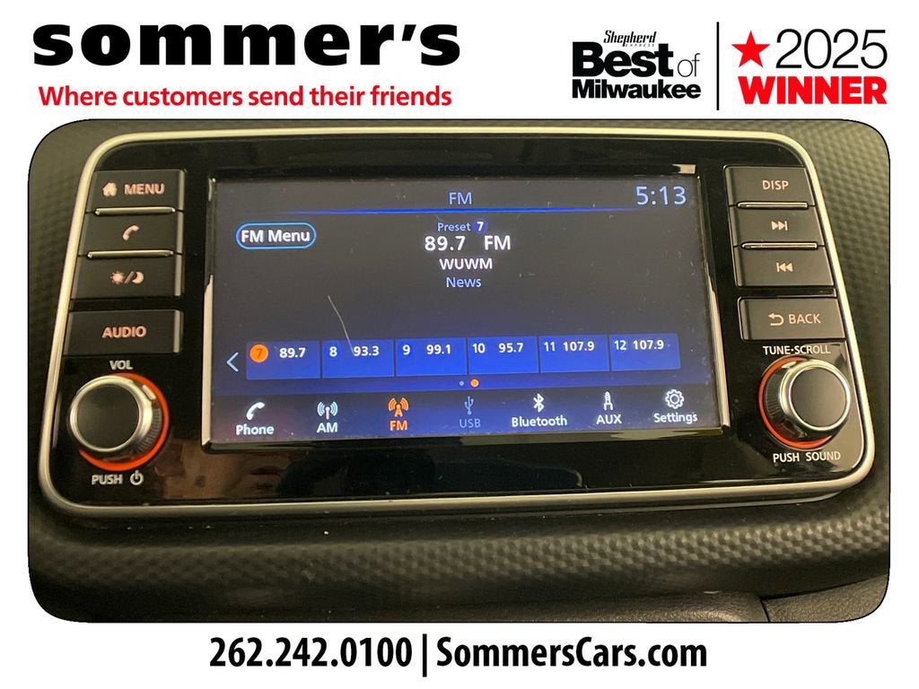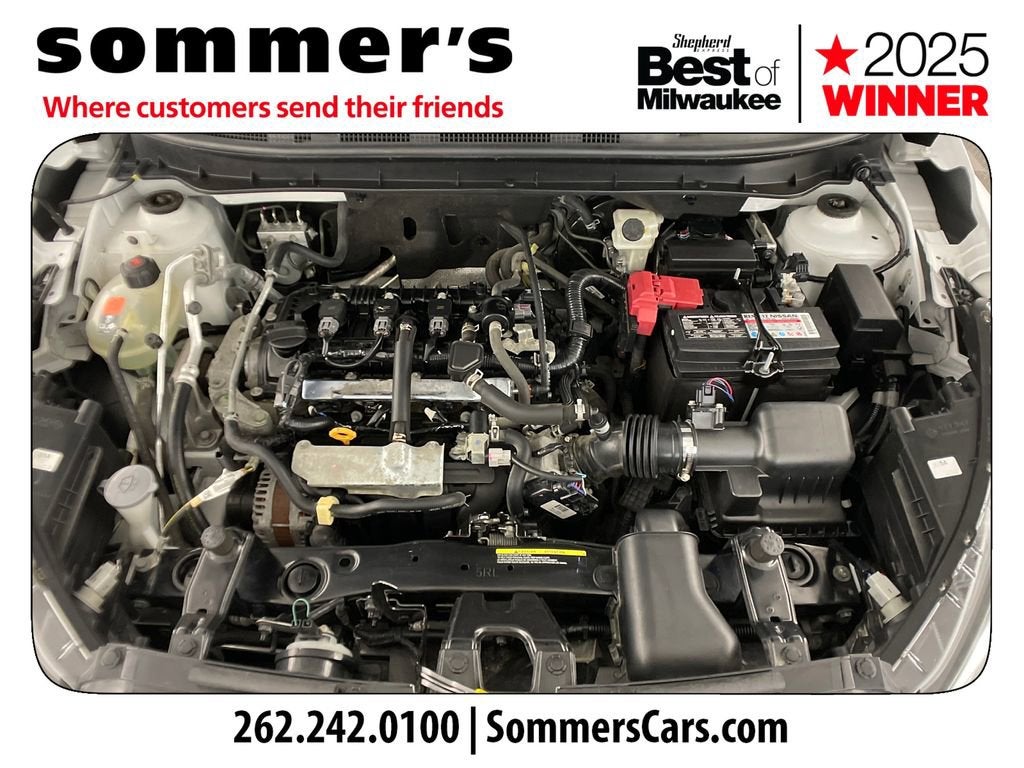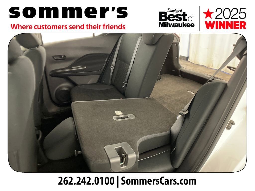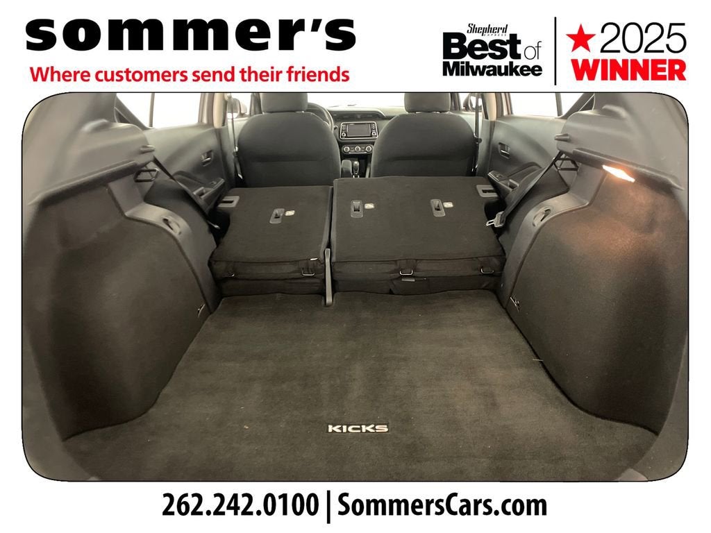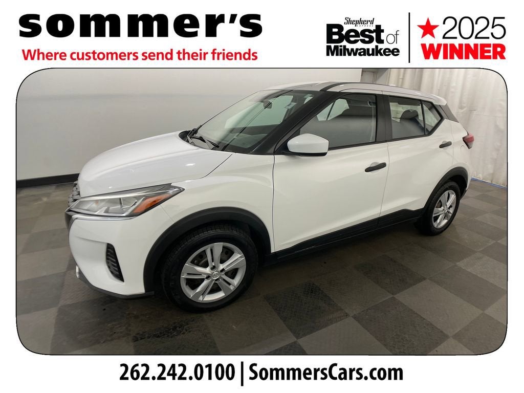 2021 Nissan Kicks S CVT FWD with Apple CarPlay, Android Auto, and 31/36 MPGFWD | 1.6L DOHC 16-Valve 4-Cylinder | Xtronic CVT | Apple CarPlay | Android Auto | Remote Keyless Entry w/Push Button Start | 7-in Color Display | Backup Camera | Bluetooth® | 16-in Steel Wheels w/Full Wheel Covers | Automatic Headlights | RearView Monitor | 31/36 City/Highway MPGPerformanceThe 1.6L 4-cylinder engine pairs with Nissan's Xtronic CVT for smooth, efficient power delivery. Front-wheel drive and 4-wheel disc brakes with ABS and Brake Assist support confident daily driving.Comfort & ConvenienceRemote keyless entry with push button start and air conditioning keep every drive simple and comfortable. Power windows and locks, cruise control with steering wheel controls, and 60/40 split rear seats add everyday versatility.TechnologyApple CarPlay and Android Auto integrate your smartphone through the 7-inch color display. Bluetooth® hands-free calling, streaming audio, SiriusXM capability, and a RearView Monitor enhance connectivity and visibility.SafetyAutomatic Emergency Braking with Pedestrian Detection, Forward Collision Warning, and Rear Automatic Braking help monitor traffic ahead and behind. Blind Spot Warning, Rear Cross Traffic Alert, Lane Departure Warning, and High Beam Assist add driver support.Exterior & InteriorSharp exterior styling features automatic headlights, variable intermittent wipers, heated power mirrors, rear spoiler, and 16-inch steel wheels with full covers. Inside, Charcoal cloth seating, adjustable steering wheel, and ample cargo space create a practical, comfortable cabin.Driving ExperienceLight, efficient, and easy to maneuver in city traffic and tight parking spaces.History SummaryCARFAX 1-Owner vehicle - personal vehicle.No accidents or damage reported.No Open Recalls reported.Last reported odometer reading: 41,517 miles.3N1CP5BV9ML465029Find this 2021 Nissan Kicks S CVT at Sommer's Automotive in Mequon, just north of Milwaukee serving Wisconsin drivers from Cedarburg, Grafton, Port Washington, Shorewood, Whitefish Bay, Fox Point, Bayside, Glendale, Wauwatosa, Brookfield, West Bend, Menomonee Falls, Germantown, Sussex, Hartford, Oconomowoc, Pewaukee, New Berlin, Franklin, Oak Creek, Racine, Kenosha, Muskego, Mukwonago, Hales Corners, Cudahy, South Milwaukee, and many more communities throughout the greater Milwaukee, Ozaukee County, Washington County, Waukesha County, and southeastern Wisconsin area.