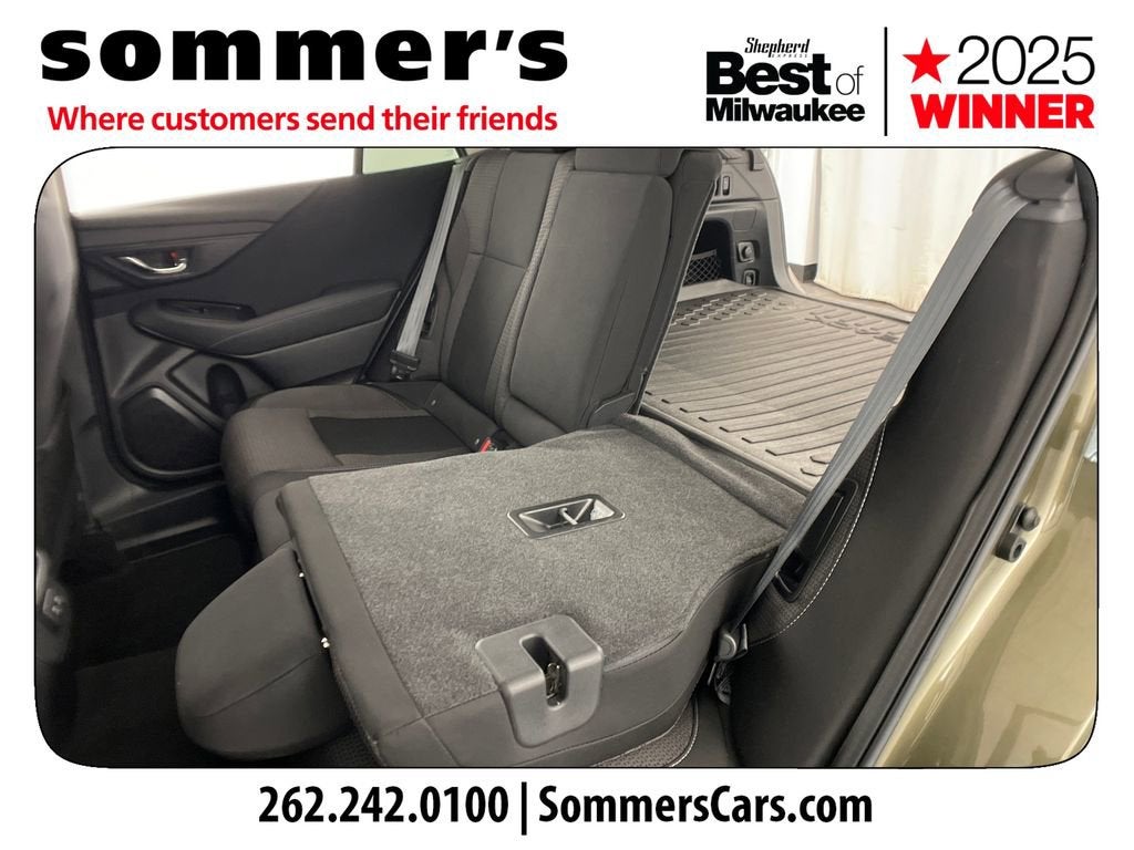 AWD | 2.5L H4 + CVT | 26/33 City/Highway MPG | Blind-Spot Monitor & Rear Cross-Traffic Alert | Adaptive cruise control | Lane Keep Assist & Lane Departure Warning | Front Collision Mitigation | Back-up camera | Apple CarPlay & Android Auto | Wi-Fi hotspot | Heated front seats | 8-way power driver seat w/lumbar | Hands-free power liftgate & remote trunk release | Keyless entry & push-button start | LED headlights w/auto high beams & fog lamps | Aluminum wheels | Luggage rack & privacy glass | Autumn Green Metallic exterior