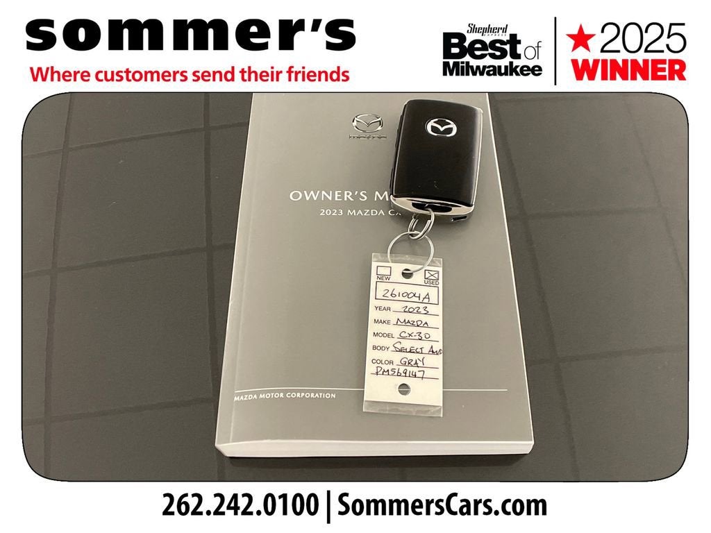 Find this 2023 Mazda CX-30 2.5 S Select at Sommer's Automotive in Mequon, just north of Milwaukee serving Wisconsin drivers from Cedarburg, Grafton, Port Washington, Shorewood, Whitefish Bay, Fox Point, Bayside, Glendale, Wauwatosa, Brookfield, West Bend, Menomonee Falls, Germantown, Sussex, Hartford, Oconomowoc, Pewaukee, New Berlin, Franklin, Oak Creek, Racine, Kenosha, Muskego, Mukwonago, Hales Corners, Cudahy, South Milwaukee, and many more communities throughout the greater Milwaukee, Ozaukee County, Washington County, Waukesha County, and southeastern Wisconsin area.
