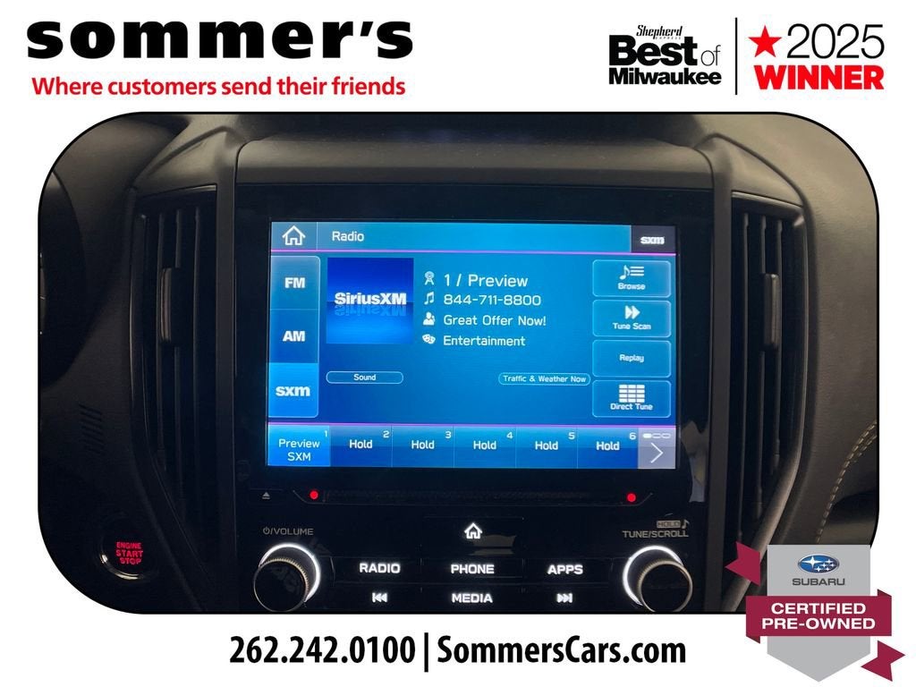 AWD | 2.5L H-4 | CVT w/Dual Shift Mode | Power Moonroof | Heated Front Seats | Premium Synthetic Seats | Adaptive Cruise Control | Blind Spot Monitor | Apple CarPlay | Android Auto | 18-in Aluminum Wheels | LED Headlights | Fog Lamps | Rear Spoiler | 27/34 City/Highway MPG