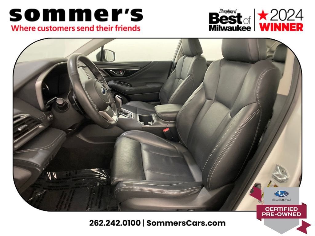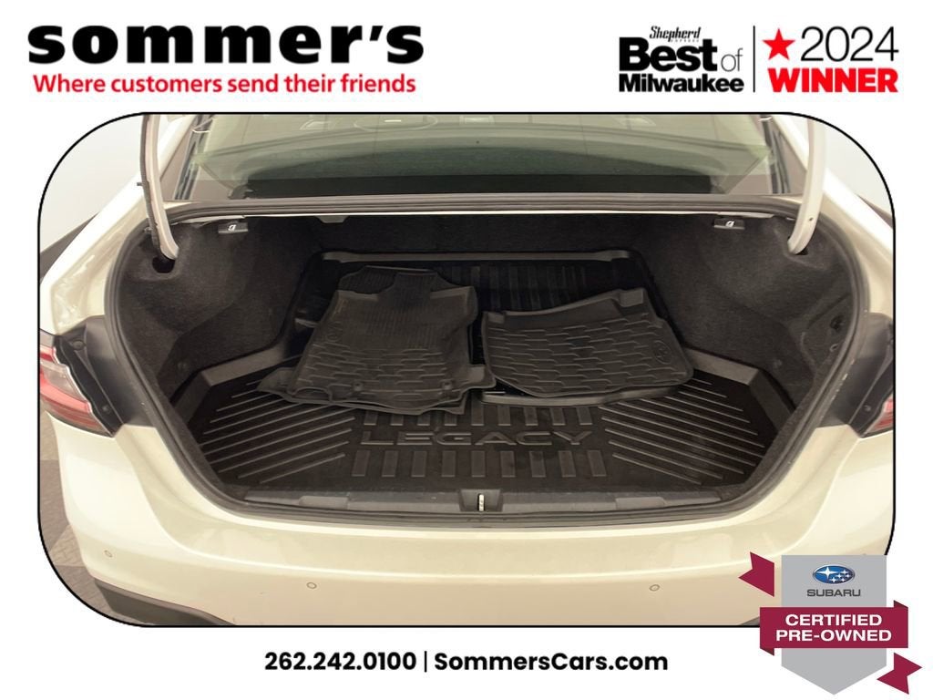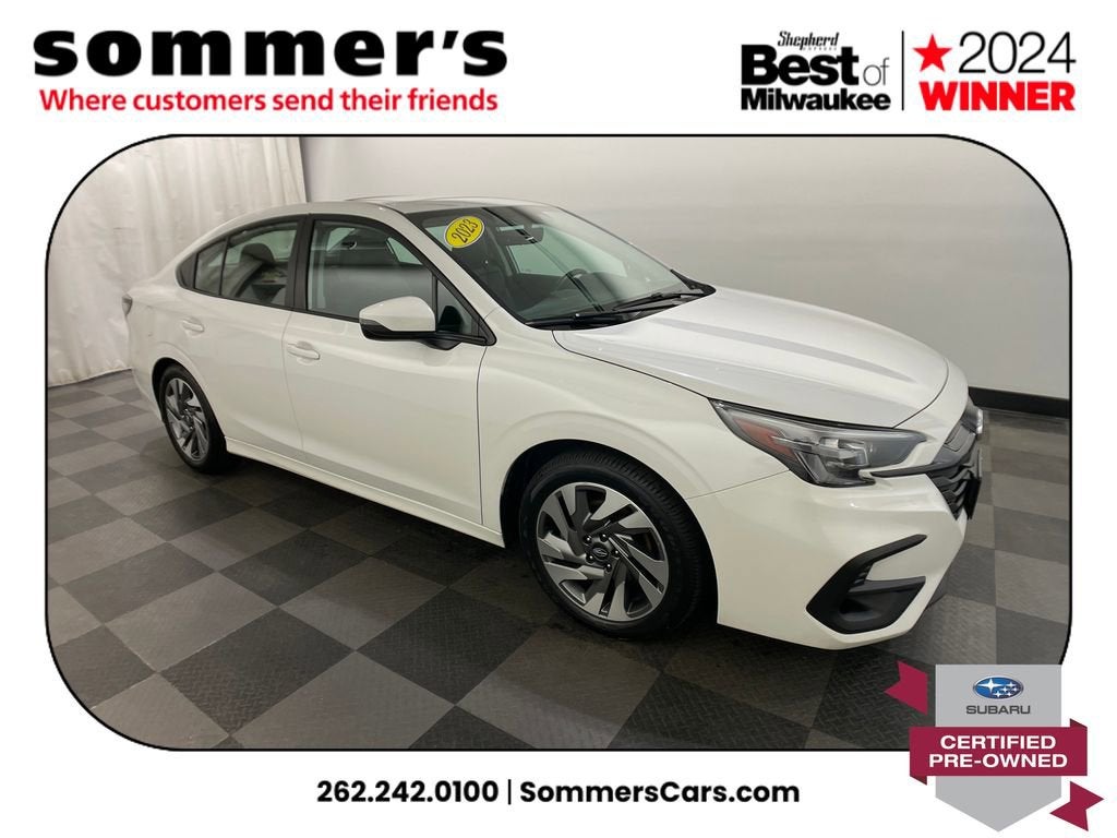 2023 Subaru Legacy Limited Certified Pre-Owned, One Owner. AWD 2.5L H-4 CVT, heated leather seats, Sun/Moonroof, Navigation, premium audio, 27/35 MPG.AWD | 2.5L H-4 w/CVT | Heated leather front seats | Power driver & passenger seats w/memory | Sun/Moonroof | Navigation system | Premium sound system | Apple CarPlay & Android Auto | Adaptive cruise w/lane keep | Blind-spot monitor & Rear Cross-Traffic Alert | Driver Monitoring | LED headlights w/auto high beams | Heated mirrors w/turn signals | Auto-dimming mirror & Universal Garage Door Opener | Dual-zone climate control | Back-up camera | Aluminum wheels | Crystal White Pearl exteriorCPO benefits152-point inspection | 84 mo/100,000 mi powertrain from original in-service date | $0 deductible | 24/7 roadside assistance | Vehicle history | Transferable warranty | SiriusXM 3-month trial | STARLINK 1-year trial.PerformanceSymmetrical AWD and the 2.5L H-4 with CVT deliver smooth power and confident traction. EPA-rated 27/35 MPG keeps trips efficient without sacrificing all-weather capability.Comfort & ConvenienceHeated leather fronts plus power driver and passenger seats with memory tailor support for every driver. Dual-zone climate control and keyless start make daily use easy.TechnologyBuilt-in Navigation teams with Apple CarPlay and Android Auto to keep routes and playlists close. An auto-dimming mirror and universal garage opener add everyday convenience.SafetyAdaptive cruise with lane centering, lane departure warning, and lane keeping assist help manage traffic. Blind-spot monitoring with Rear Cross-Traffic Alert and a clear backup camera boost awareness.Exterior & InteriorCrystal White Pearl paint, aluminum wheels, LED headlights with auto high beams, fog lamps, and heated turn-signal mirrors enhance visibility and style. A bright Sun/Moonroof opens the cabin.Driving ExperienceQuiet, composed, and surefooted for Wisconsin commutes and weekend escapes.History SummaryOne Owner, Certified Pre-Owned, No Open Recalls, and Active Warranty per the Vehicle History Report. Note: minor accident reported in 2023.VIN: 4S3BWAN6XP3008030Find this 2023 Subaru Legacy Limited at Sommer's Automotive in Mequon, just north of Milwaukee serving Wisconsin drivers across Cedarburg, Grafton, Port Washington, Shorewood, Whitefish Bay, Fox Point, Bayside, Glendale, Wauwatosa, Brookfield, West Bend, Menomonee Falls, Germantown, Sussex, Hartford, Oconomowoc, Pewaukee, New Berlin, Franklin, Oak Creek, Racine, Kenosha, Muskego, Mukwonago, Hales Corners, Cudahy, South Milwaukee, and many more communities throughout the greater Milwaukee, Ozaukee County, Washington County, Waukesha County, and southeastern Wisconsin area.