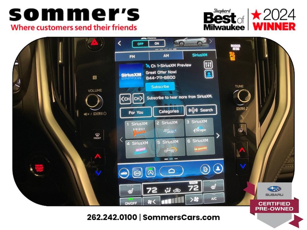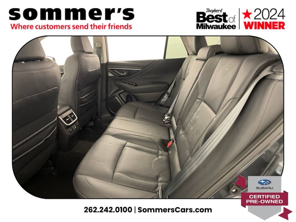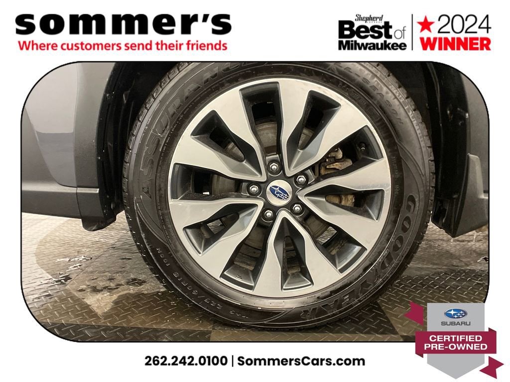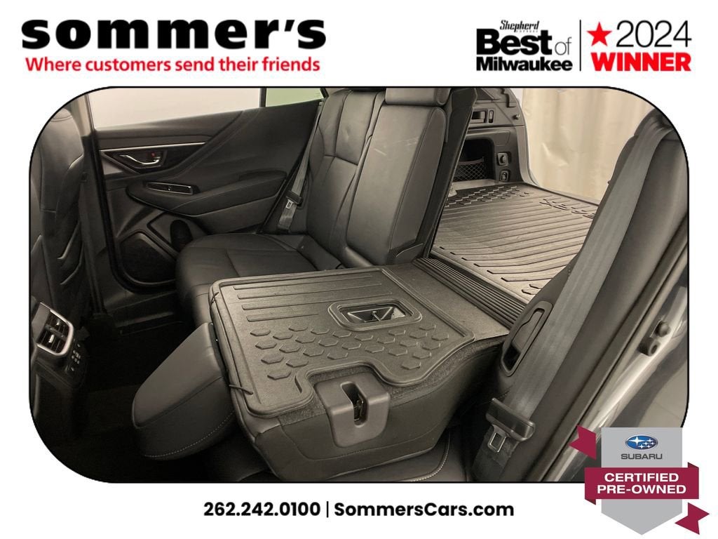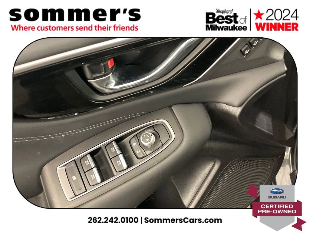 AWD | 2.5L H-4 | CVT w/dual shift mode | 26/32 MPG | Panoramic sun/moonroof | Heated front seats | Heated steering wheel | Leather seating surfaces | 10-way power driver seat w/memory & lumbar | Power passenger seat | Navigation & Premium Sound | Apple CarPlay & Android Auto | Wi-Fi hotspot & telematics | Hands-free power liftgate | Back-up camera | Blind spot monitor | Adaptive cruise w/lane keep & Evasion Assist | LED headlights w/Auto High Beam | Heated mirrors w/turn signals | Universal garage door opener