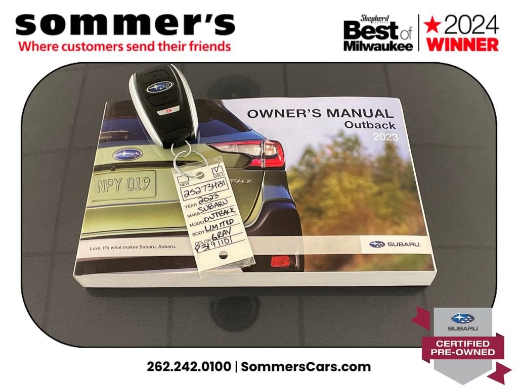 Find this 2023 Subaru Outback Limited at Sommer's Automotive in Mequon, just north of Milwaukee serving Wisconsin drivers from Cedarburg, Grafton, Port Washington, Shorewood, Whitefish Bay, Fox Point, Bayside, Glendale, Wauwatosa, Brookfield, West Bend, Menomonee Falls, Germantown, Sussex, Hartford, Oconomowoc, Pewaukee, New Berlin, Franklin, Oak Creek, Racine, Kenosha, Muskego, Mukwonago, Hales Corners, Cudahy, South Milwaukee, and many more communities throughout the greater Milwaukee, Ozaukee County, Washington County, Waukesha County, and southeastern Wisconsin area.