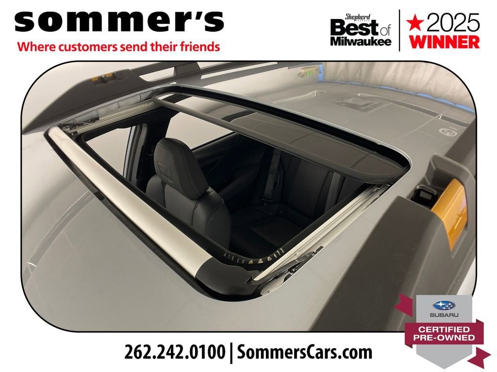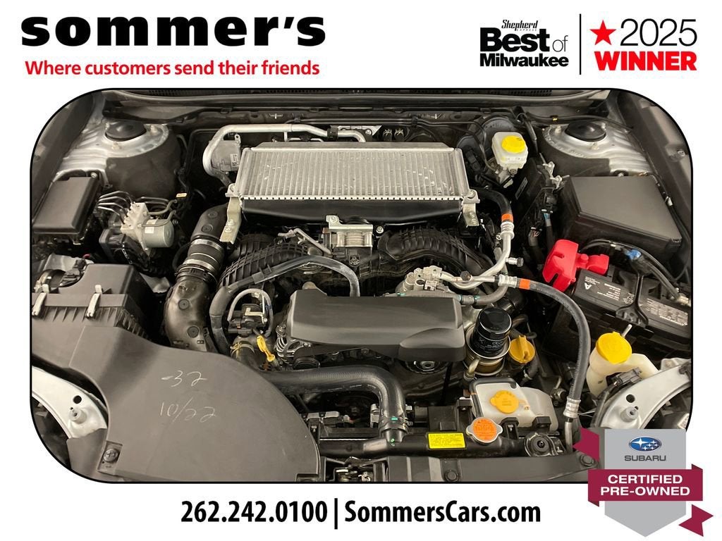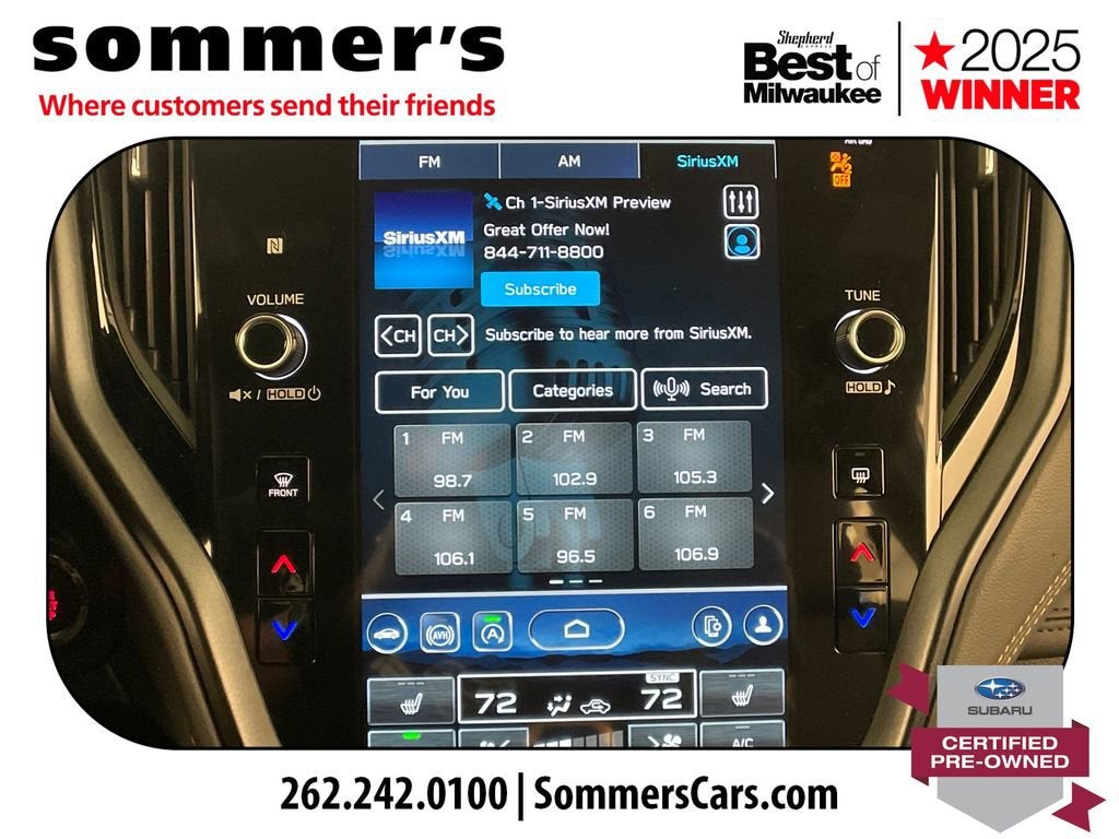AWD | 2.4L turbo H-4 | 21/26 MPG | EyeSight adaptive cruise & lane keep | Blind-Spot Monitor + Rear Cross-Traffic Alert | Navigation w/Apple CarPlay/Android Auto | Power liftgate | Heated front and rear seats | Power driver seat | Moonroof | LED headlights w/auto high beam | Fog lights | Ice Silver Metallic | Keyless entry/start | Backup camera | Roof rails | Universal garage door opener