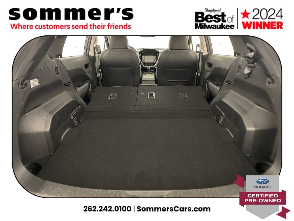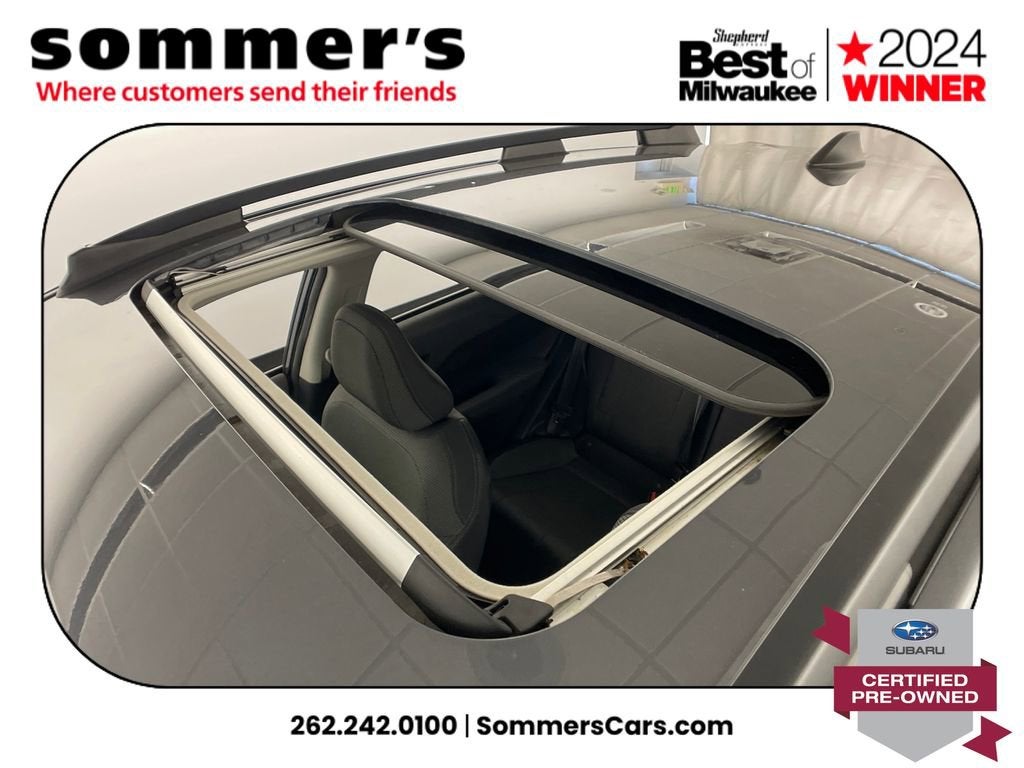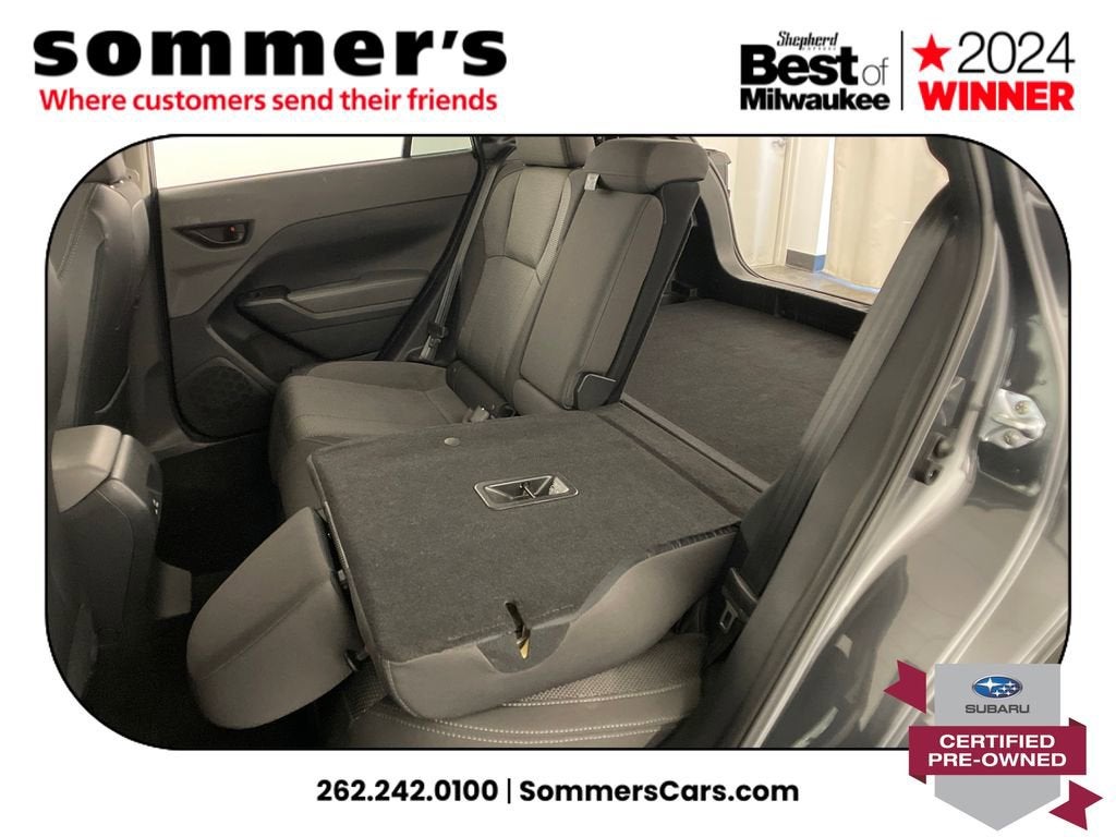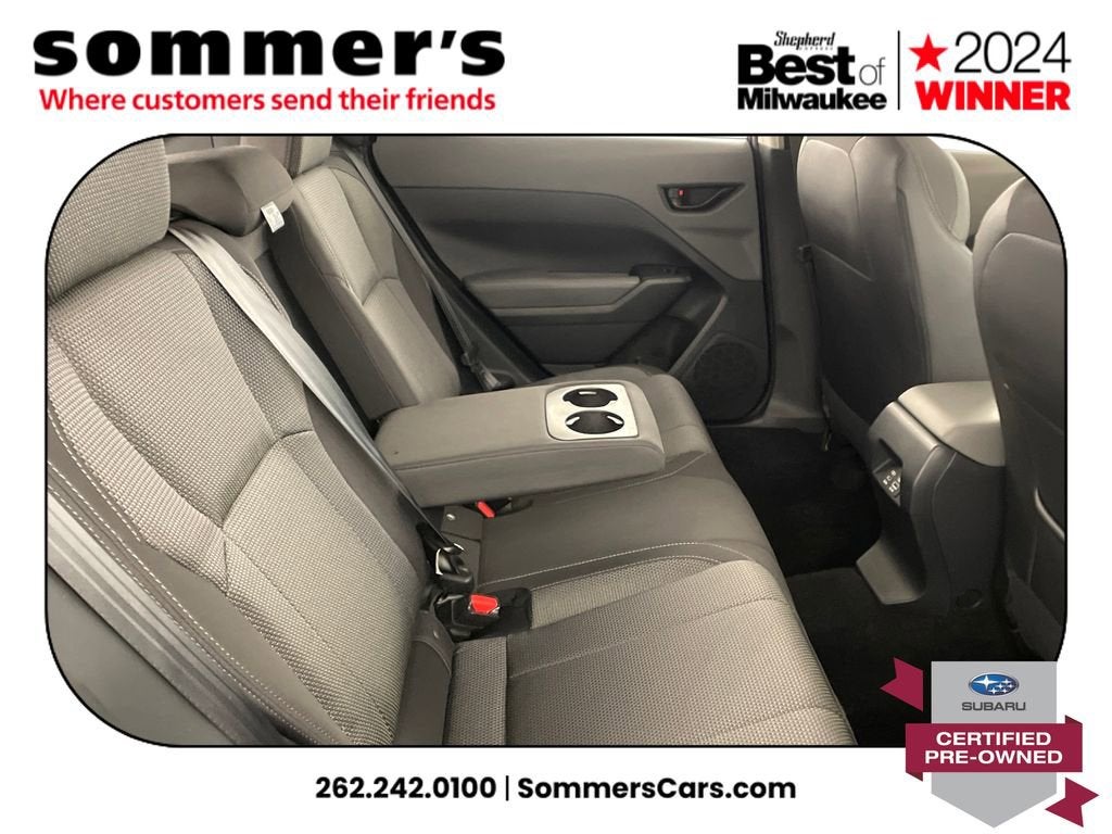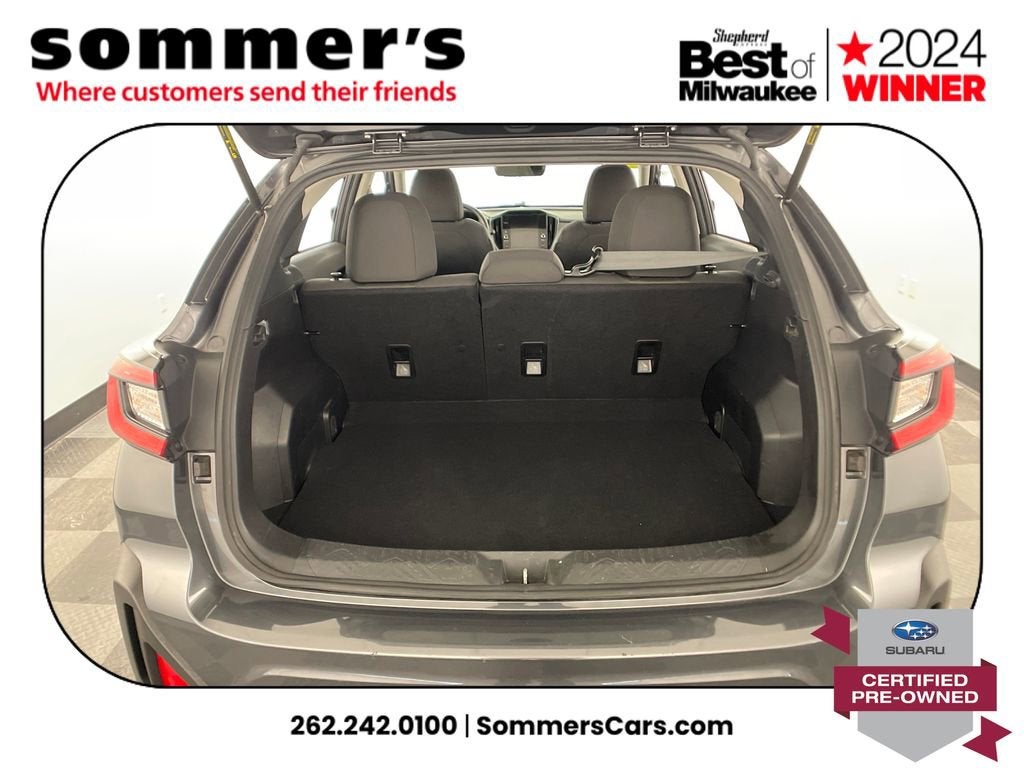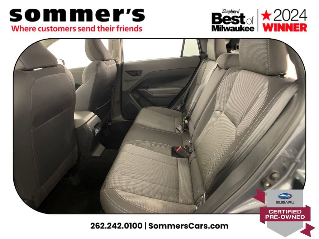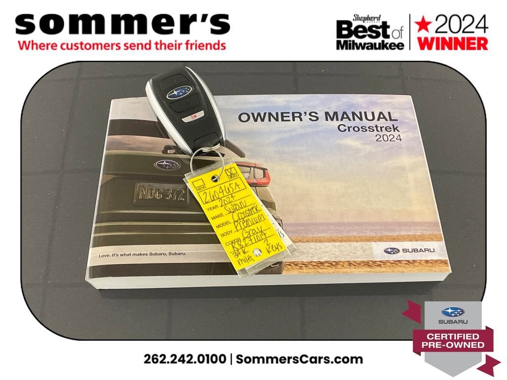 2024 Subaru Crosstrek Premium Certified Pre-Owned AWD, 2.0L H-4 CVT, moonroof, heated front seats, Apple CarPlay/Android Auto, 27/34 MPG. One Owner.AWD | 2.0L H-4 | Lineartronic CVT | 27/34 MPG | Sun/moonroof | Heated front seats | Power driver seat w/lumbar | Driver Monitoring | Apple CarPlay & Android Auto | WiFi hotspot | Back-up camera | Auto-dimming mirror & universal garage door opener | Keyless entry & push-button start | Bluetooth® audio/phone | LED headlights w/auto-leveling & auto high beams | Fog lamps | Blind spot monitor & rear cross-traffic alert | EyeSight pre-collision braking, lane keep assist, adaptive cruise | Rear spoiler | Heated mirrors w/turn signals | Aluminum wheels | Magnetite Gray Metallic | Black interiorCPO benefits152-point inspection | 7yr/100,000mi powertrain from original in-service date | $0 deductible | 24/7 roadside assistance | Vehicle history review | Transferable warranty | STARLINK 1-year trial | SiriusXM 3-month trialPerformanceSymmetrical AWD helps you stay confident in rain and snow by directing grip where its needed. The 2.0L H-4 and CVT deliver smooth response and an EPA-rated 27/34 MPG to cut fuel stops.Comfort & ConvenienceHeated front seats take the edge off winter mornings, while the power driver seat with lumbar and memory-friendly ergonomics dial in support. The sunroof brightens the cabin, and keyless access with push-button start streamlines every errand.TechnologyApple CarPlay and Android Auto mirror maps and messages so you can keep eyes up and hands on the wheel. A back-up camera simplifies tight parking, while the auto-dimming mirror, universal garage opener, WiFi hotspot, Bluetooth®, and trip computer add daily smarts.SafetyBlind spot detection with rear cross-traffic alert helps watch the lanes and driveway. EyeSight tech adds pre-collision braking, adaptive cruise with steering assist, lane departure warning and lane keep assist, plus stability/traction control, airbags, TPMS, and a security system.Exterior & InteriorLED headlights with auto-leveling, auto high beams, and DRLs light the road; fog lamps and heated mirrors with turn signals boost visibility. Privacy glass, rear spoiler, aluminum wheels, variable intermittent wipers, cargo lighting, seatback pocket, and pass-through rear bench add utility.Driving ExperienceQuiet, composed ride with surefooted AWD traction and straightforward controls.History SummaryCertified Pre-Owned; One Owner; Clean History Report; No Open Recalls; Active Factory Warranty remaining.VIN: JF2GUADC3R8271017Find this 2024 Subaru Crosstrek Premium at Sommer's Automotive in Mequon, just north of Milwaukee serving Wisconsin drivers from Cedarburg, Grafton, Port Washington, Shorewood, Whitefish Bay, Fox Point, Bayside, Glendale, Wauwatosa, Brookfield, West Bend, Menomonee Falls, Germantown, Sussex, Hartford, Oconomowoc, Pewaukee, New Berlin, Franklin, Oak Creek, Racine, Kenosha, Muskego, Mukwonago, Hales Corners, Cudahy, South Milwaukee, and many more communities throughout the greater Milwaukee, Ozaukee County, Washington County, Waukesha County, and southeastern Wisconsin area.