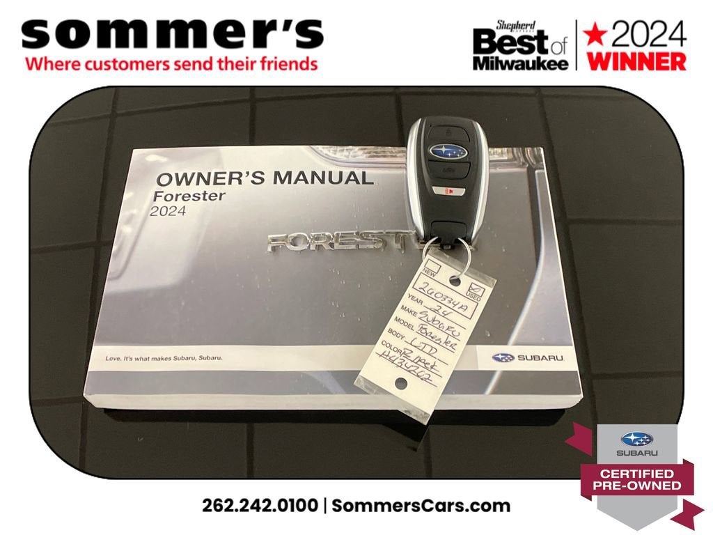 Find this 2024 Subaru Forester Limited at Sommer's Automotive in Mequon, just north of Milwaukee serving Wisconsin drivers across Cedarburg, Grafton, Port Washington, Shorewood, Whitefish Bay, Fox Point, Bayside, Glendale, Wauwatosa, Brookfield, West Bend, Menomonee Falls, Germantown, Sussex, Hartford, Oconomowoc, Pewaukee, New Berlin, Franklin, Oak Creek, Racine, Kenosha, Muskego, Mukwonago, Hales Corners, Cudahy, South Milwaukee, and many more communities throughout the greater Milwaukee, Ozaukee County, Washington County, Waukesha County, and southeastern Wisconsin area.