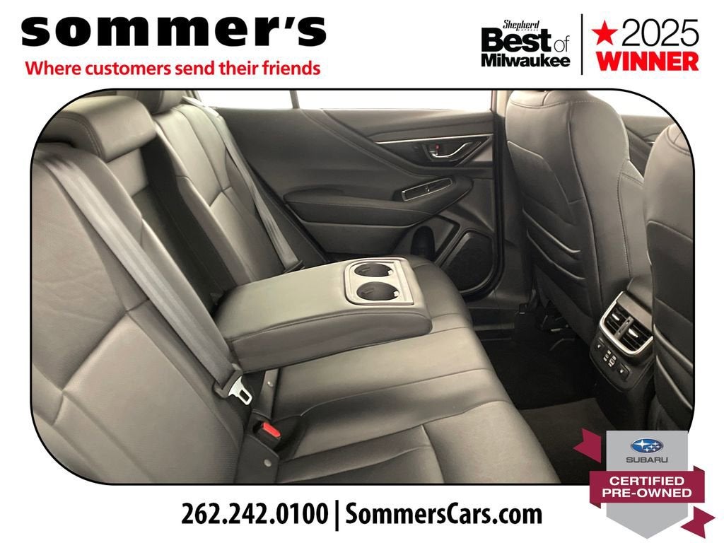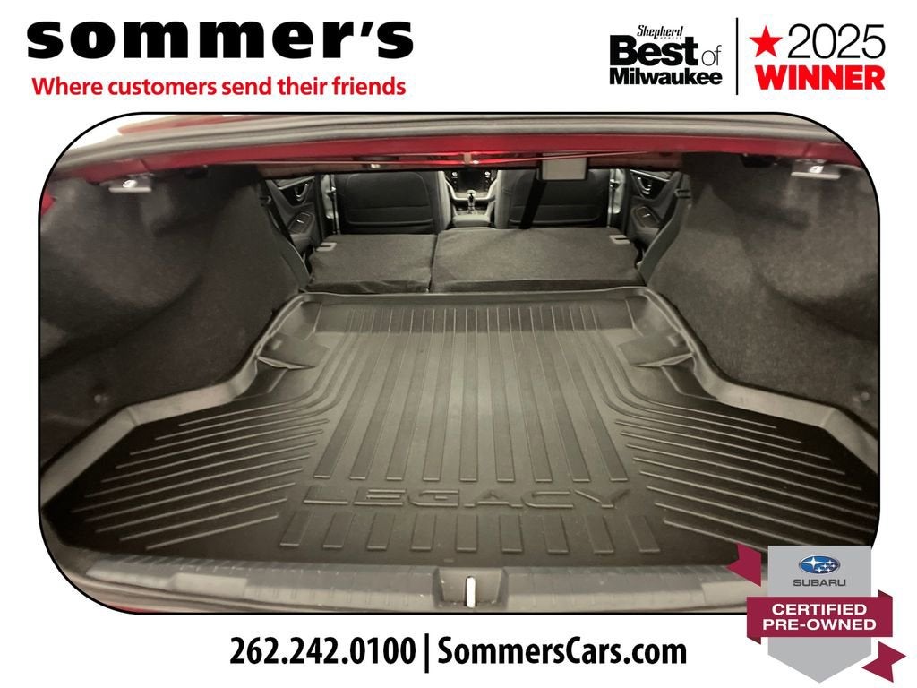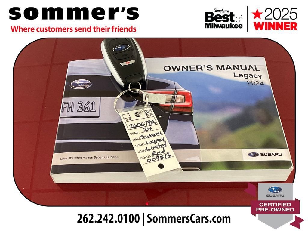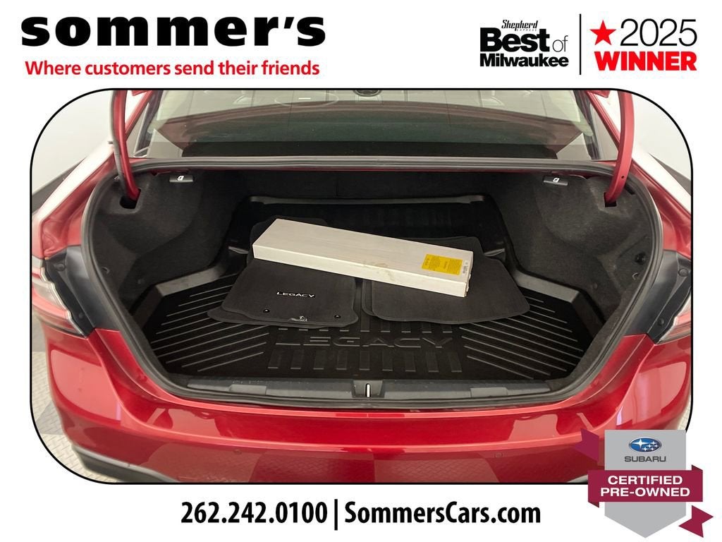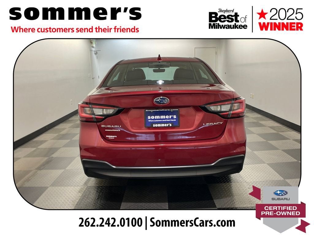 2024 Subaru Legacy Limited Certified Pre-Owned, One Owner AWD 2.5L, leather, heated seats, moonroof, navigationAWD | 2.5L SUBARU BOXER H-4 | CVT | 27/35 city/highway MPG | leather-trimmed seating | heated front seats | heated rear seats | heated steering wheel | power front seats | driver's seat memory | Apple CarPlay | Android Auto | navigation system | premium sound system | sun/moonroof | blind spot monitor | LED headlights | adaptive cruise controlCPO benefits: 152-point inspection | 84-month/100,000-mile powertrain limited warranty from original in-service date | $0 deductible | roadside assistance | vehicle history | transferable warranty | SiriusXM 3-month trial | 1-year STARLINK trialPerformanceThe 2.5L SUBARU BOXER engine and CVT deliver smooth, efficient power for daily driving. Full-time AWD adds steady control in changing road conditions.Comfort & ConvenienceLeather-trimmed seating, heated front and rear seats, and a heated steering wheel help keep the cabin comfortable. Power front seats, driver's memory, and dual-zone climate control add everyday ease.TechnologyApple CarPlay and Android Auto pair with navigation for easy access to calls, music, and maps. A premium sound system, moonroof, Bluetooth®, and telematics round out the cabin.SafetyBlind spot monitor, back-up camera, and rear traffic awareness features help in busy parking lots and traffic. Adaptive cruise control, lane keeping assist, and front collision mitigation support highway travel.Exterior & InteriorCrimson Red Pearl paint, LED headlights, fog lamps, and aluminum wheels give this Legacy a clean, upscale look. Inside, the Slate Black cabin adds a leather steering wheel, auto-dimming rearview mirror, and useful storage.Driving ExperienceComfortable, quiet, and composed, with AWD confidence and the smooth road manners Legacy drivers expect.History SummaryOne OwnerCertified Pre-OwnedClean History ReportNo Open RecallsActive Warranty4S3BWAN6XR3009648Find this 2024 Subaru Legacy Limited at Sommer's Automotive in Mequon, just north of Milwaukee serving Wisconsin drivers from Cedarburg, Grafton, Port Washington, Shorewood, Whitefish Bay, Fox Point, Bayside, Glendale, Wauwatosa, Brookfield, West Bend, Menomonee Falls, Germantown, Sussex, Hartford, Oconomowoc, Pewaukee, New Berlin, Franklin, Oak Creek, Racine, Kenosha, Muskego, Mukwonago, Hales Corners, Cudahy, South Milwaukee, and many more communities throughout the greater Milwaukee, Ozaukee County, Washington County, Waukesha County, and southeastern Wisconsin area.