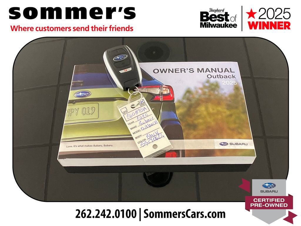 Elevate your driving experience with this stunning 2025 Subaru Outback Onyx Edition. Boasting a sleek black exterior and a wealth of premium features, this certified pre-owned SUV is ready to take on any adventure.- Cargo Net- Rear Seat Back Protector- All-Weather Floor Liners- Rear Bumper Cover- LED UpgradeBeneath the bold exterior, this Outback is powered by a 2.5L 4-cylinder DOHC 16V engine, delivering a seamless and efficient driving experience with its Lineartronic CVT and Subaru's renowned Symmetrical All-Wheel Drive system. Enjoy impressive fuel efficiency, with an EPA-estimated 26 city/32 highway MPG.Step inside and you'll be greeted by a spacious, well-appointed cabin that sets the Outback apart. Sink into the supportive StarTex-trimmed seats, which can be heated for added comfort on chilly days. The Subaru 11.6 Multimedia Plus System provides cutting-edge connectivity, while the harman/kardon® premium audio system delivers a concert-hall experience.With a wealth of advanced safety features, including Subaru's EyeSight Driver Assist Technology, you can drive with confidence, knowing you and your loved ones are well-protected. The Outback's capable suspension and responsive handling make it a joy to pilot, whether navigating city streets or tackling rugged terrain.As a Subaru Certified Pre-Owned vehicle, this Outback Onyx Edition comes with an extensive 152-point inspection, Roadside Assistance, a Transferable Warranty, and a Powertrain Limited Warranty that extends up to 84 months/100,000 miles from the original in-service date. Plus, you'll enjoy a 3-month SiriusXM trial subscription, a $500 Owner Loyalty coupon, and a 1-year trial subscription to STARLINK.At Sommer's Automotive in Mequon, we're proud to help drivers from across Milwaukee, Mequon, Waukesha, Brookfield, Whitefish Bay, Thiensville, Shorewood, Cedarburg, Grafton, Menomonee Falls, Sheboygan, West Bend, Fond du Lac, Madison, Kenosha, Racine, West Allis, Glendale, Greendale, Greenfield, Cudahy, Franklin, Oak Creek, Brown Deer, and beyond find the perfect vehicle. Our team is here to make your car-buying experience smooth, transparent, and enjoyable.
